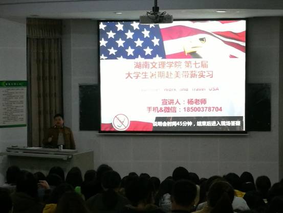 随后,杨老师简单的介绍了包括口语测试,企业面试等在内的赴美概况,并向同学们分享了往年赴美学生的照片。接下来杨老师重点介绍了这次赴美带薪的项目内容,其中包括签证基本常识及规格,赴美的时间安排,项目安全性,实习地点以及实习工作的内容、环境和住宿情况等等。使同学们更加直观的详细了解了赴美带薪此次活动的内容与意义。