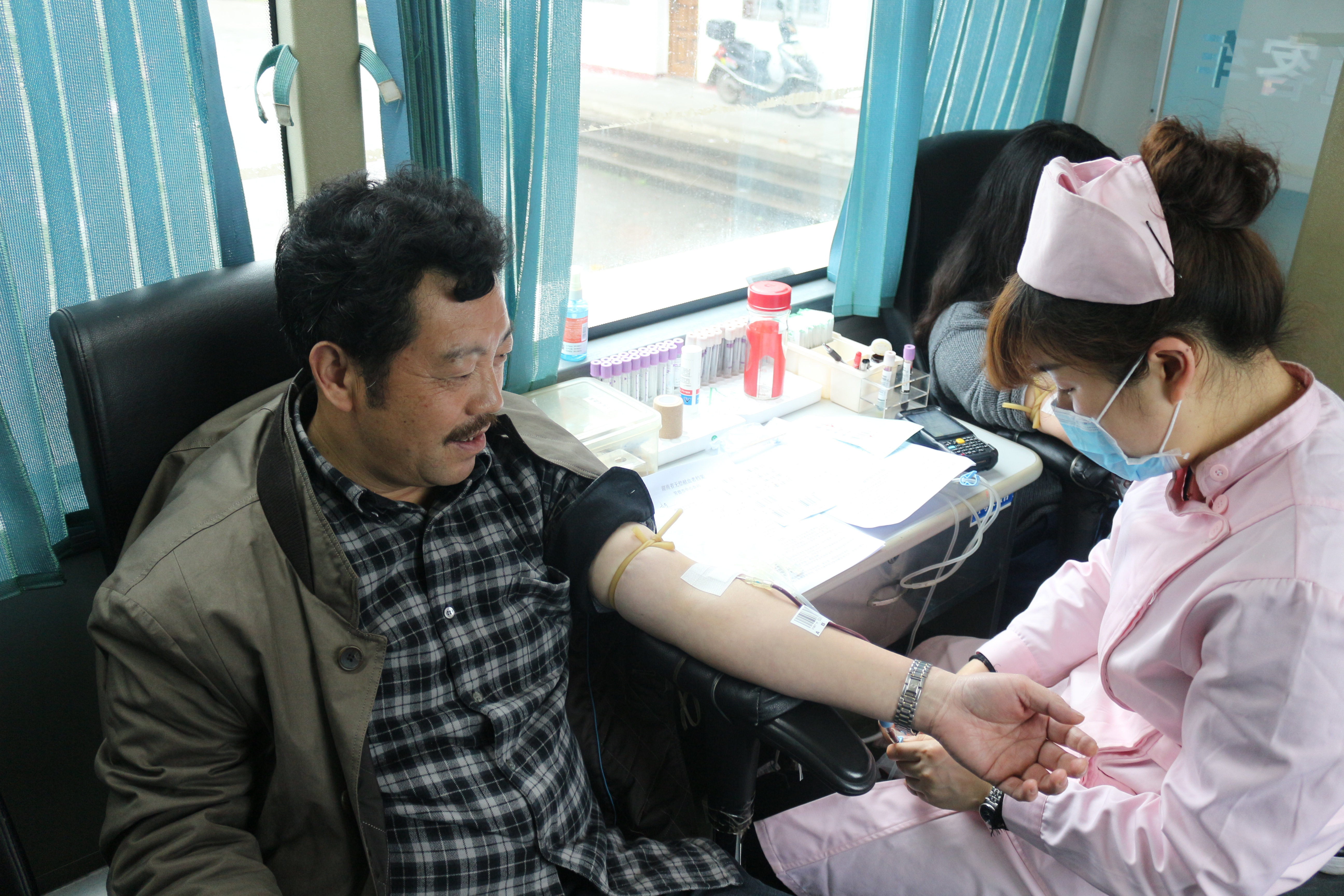 活动开始第一天,许多老师同学踊跃参加到活动中来。首先由学生干部组成工作人员维护现场秩序,并指导现场同学登记表格,填好相关的个人信息。然后由医务人员检验血型以及询问学生的健康状况。检验合格后的学生方可进入采血车进行输血,由电脑上完成身份验证和血液登记。抽血过程中,由于许多同学是第一次献血导致内心紧张和恐惧,但在医务人员的耐心安抚以及同学之间相互鼓励下,战胜了内心的恐惧。输血成功后,医务人员还详细叮嘱献血者需要注意的事项。
