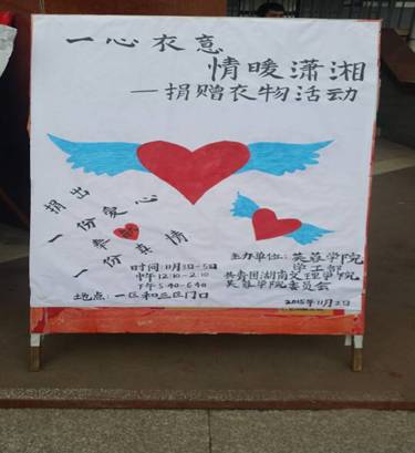 10月26日至28日,芙蓉学院开展了“一心衣意,情暖潇湘”的衣物捐赠活动。此次活动由芙蓉学院学工部与阳光爱心协会共同主办,为期三天,面向全校同学。号召大家献出自己的爱心,收集闲置旧衣物,让贫困家庭的孩子们感受到温暖和学生们对他们的关爱,为他们送去诚挚的祝福。