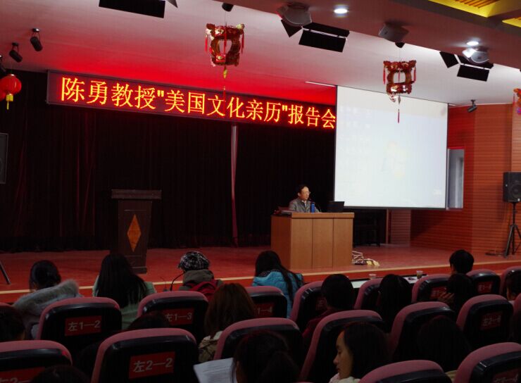 陈院长从日常生活、城市文明背景、娱乐休闲方式及高校教育四个方面介绍了美国文化。讲座开始,陈勇教授先播放了网上一段热门视频《东北小伙英文歌》,形象生动的反映了各国英语口语的差异,激发学生的兴趣和讨论,引出了“美国文化亲历”这一主题。接着,他向大家介绍了西方一些基本的货币单位与各式建筑,让同学们感受到了美国生活氛围,深化了同学们对于语言的认识和文明差异的理解。此外,陈勇院长还针对“文化侵略”这一问题,提示出我们应加强自身文化底蕴传承,取其精华,脚踏实地,立足本土。