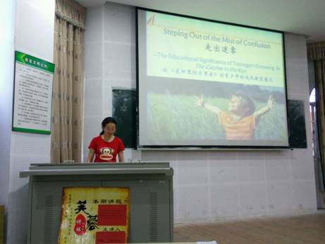 侯静凤同学用一口流利的英语为大家解读了美国作家杰罗姆.大卫.赛林格的长篇小说《麦田的守望者》,她从少年holden迷惘和觉醒的原因来分析这部作品并作了相应的思考,向大家展示她在holden成长过程中得到的的启发。她指出,holden迷惘自身原因是缺乏理想、不切实际,并鼓励大家在遇到来自生活中的困难时应以乐观积极的态度面对,正确的把握好理想与现实的关系,脚踏实地。而holden的觉醒是因为他意识到了不切实际的理想与现实的差距,是来自家庭的关爱唤醒了他,侯静凤由此呼吁社会要多给青少年关爱和鼓励,引导他们走出迷惘,寻找正确的方向。最后,指导老师李宝斌和张雪两位老师各自做了发言,教导大家要在现实和理想中寻求平衡,不断前进,只有这样才能实现自己的远大理想,并鼓励大家多多展现自己。