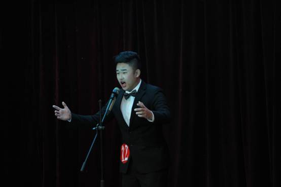 十二号选手音乐1402班周家宏以非凡的实力,精湛的唱功,演唱了一首意大利歌曲《恒河上升起太阳》,与一号选手并列第一。