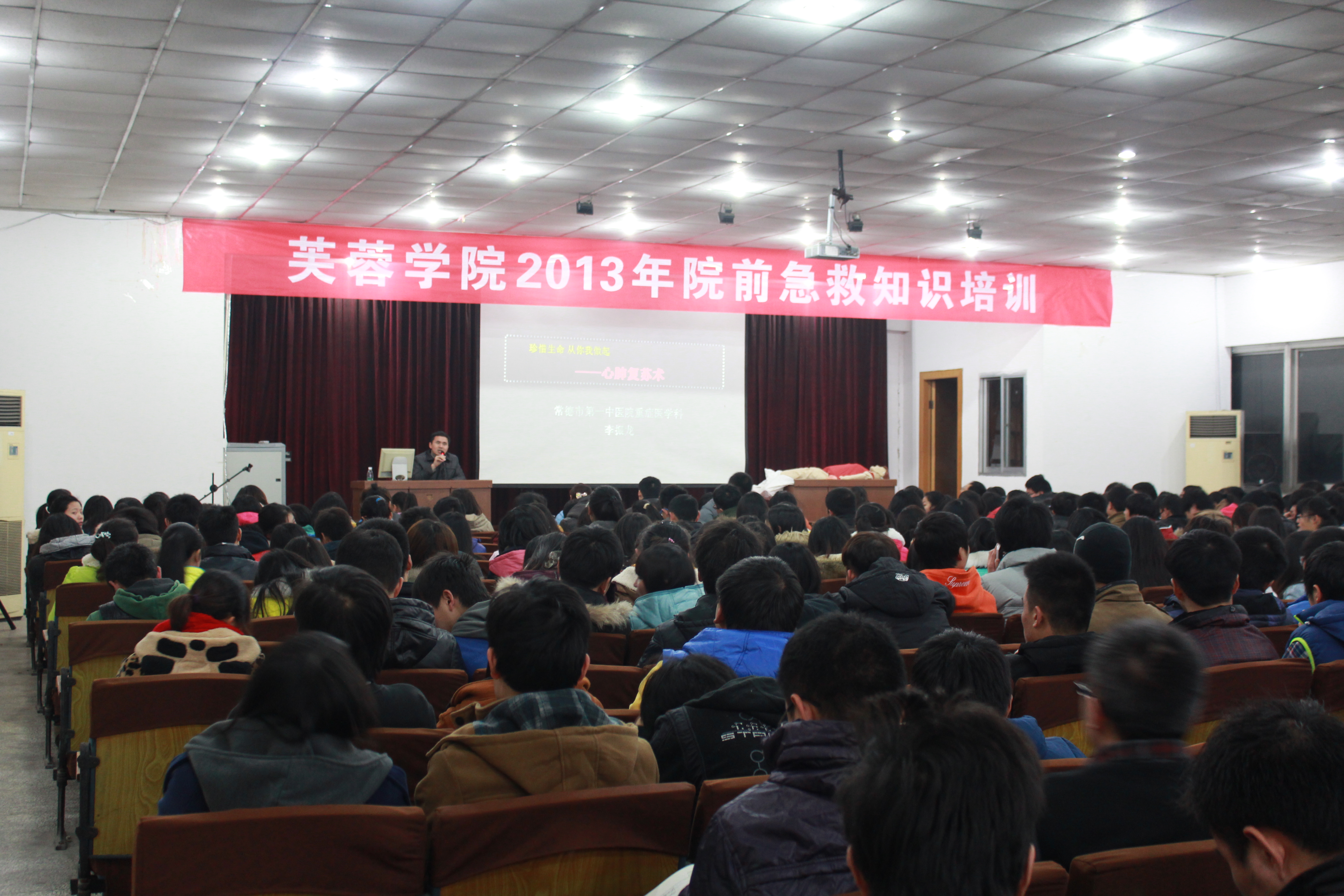 2013年12月24日晚7点,芙蓉学院学生工作部和后勤保障部在多功能报告厅举办了主题为《珍惜生命,从你我做起——心肺复苏术》的院前急救知识培训。培训会由常德是市第一中医院重症医学科主任李振龙主讲。院学生工作部主任唐国胜,院、系、班主要干部参加了此次培训会。