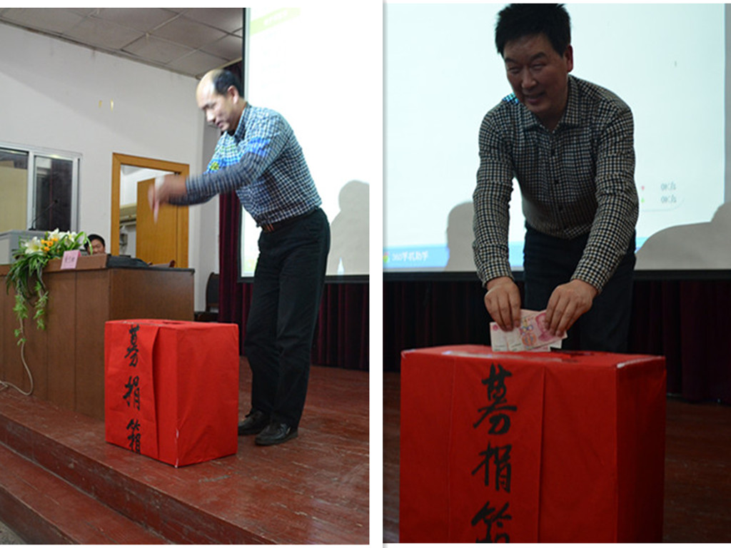 3月25日至30日在多功能报告厅进行的党员群众路线的学习前,我院党总支周书记进行组织与号召,发起全校性的为丁滔同学捐款献爱心活动。活动本着不记名募捐的方式进行:20元,50元,100元……或许一个人的力量不大,但涓涓细水可以汇成大海。病魔无情,人间有爱!丁滔遇到了困难,我们就是他坚强的后盾。