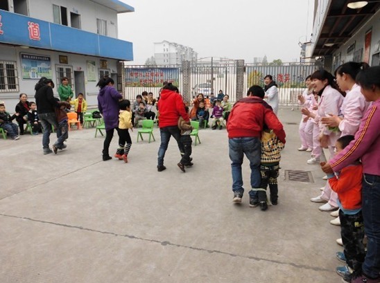 下午三点,志愿者们陪伴患儿做起《两人三足》《吹泡泡》《抢凳子》等等有益于沟通和锻炼身体的游戏。孩子们踊跃参与,整个活动现场显得热闹非凡。