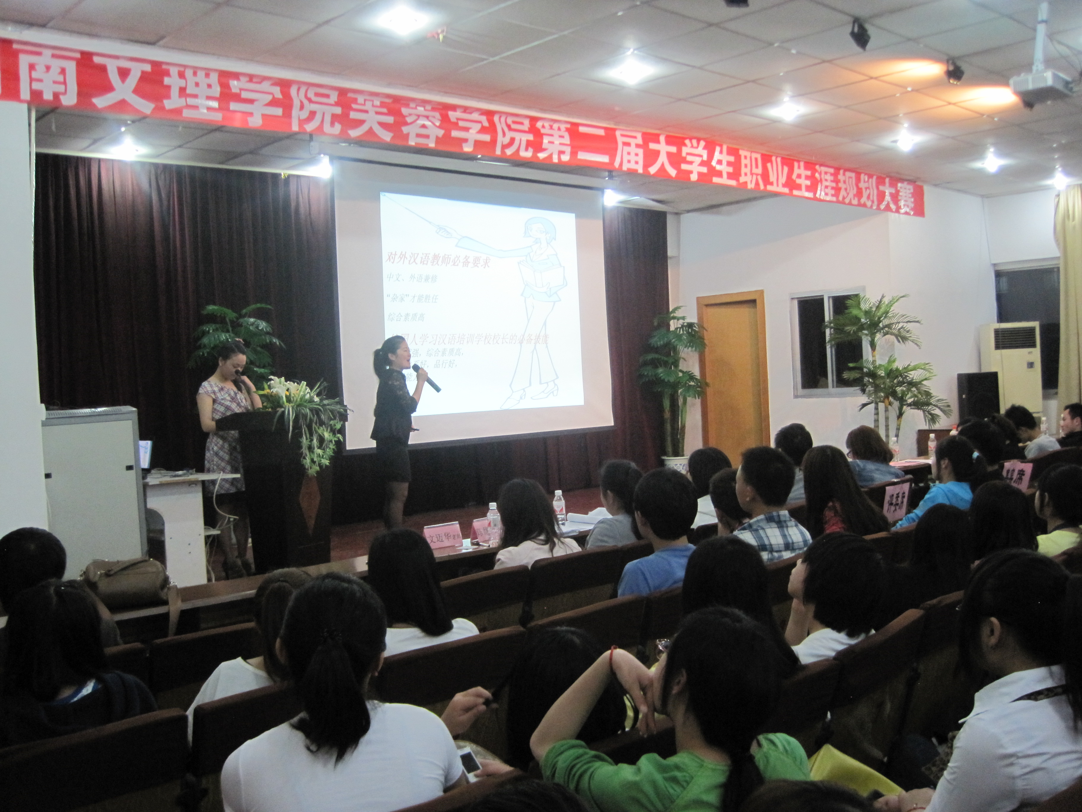 2012年4月25日晚7:00,由芙蓉学院学工部主办,经济与管理系承办的第二届大学生职业生涯规划大赛决赛在多功能报告厅拉开帷幕,来自四个系部的十名参赛选手展开了精彩激烈的角逐,吸引了近400学生进行观看。