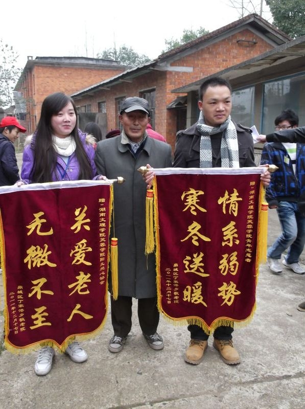 2011年12月17日,在院团委社会实践部部长徐小龙、副部长王君球的带领下,我院青年志愿者团队联合阳光爱心协会共50余人前往丁家港开展了“慰问孤寡老人 奉献你我爱心”公益活动。常德电视台新闻频道、都市频道、公共频道全程跟踪报道。