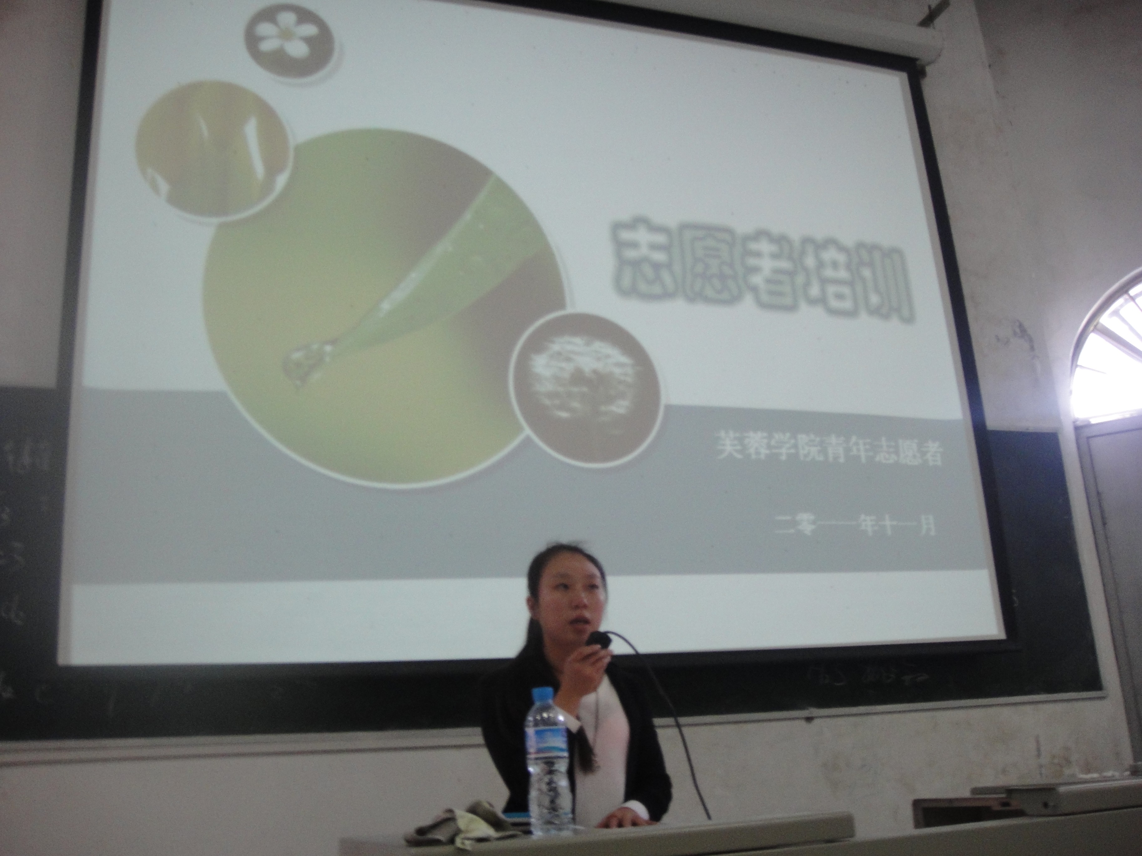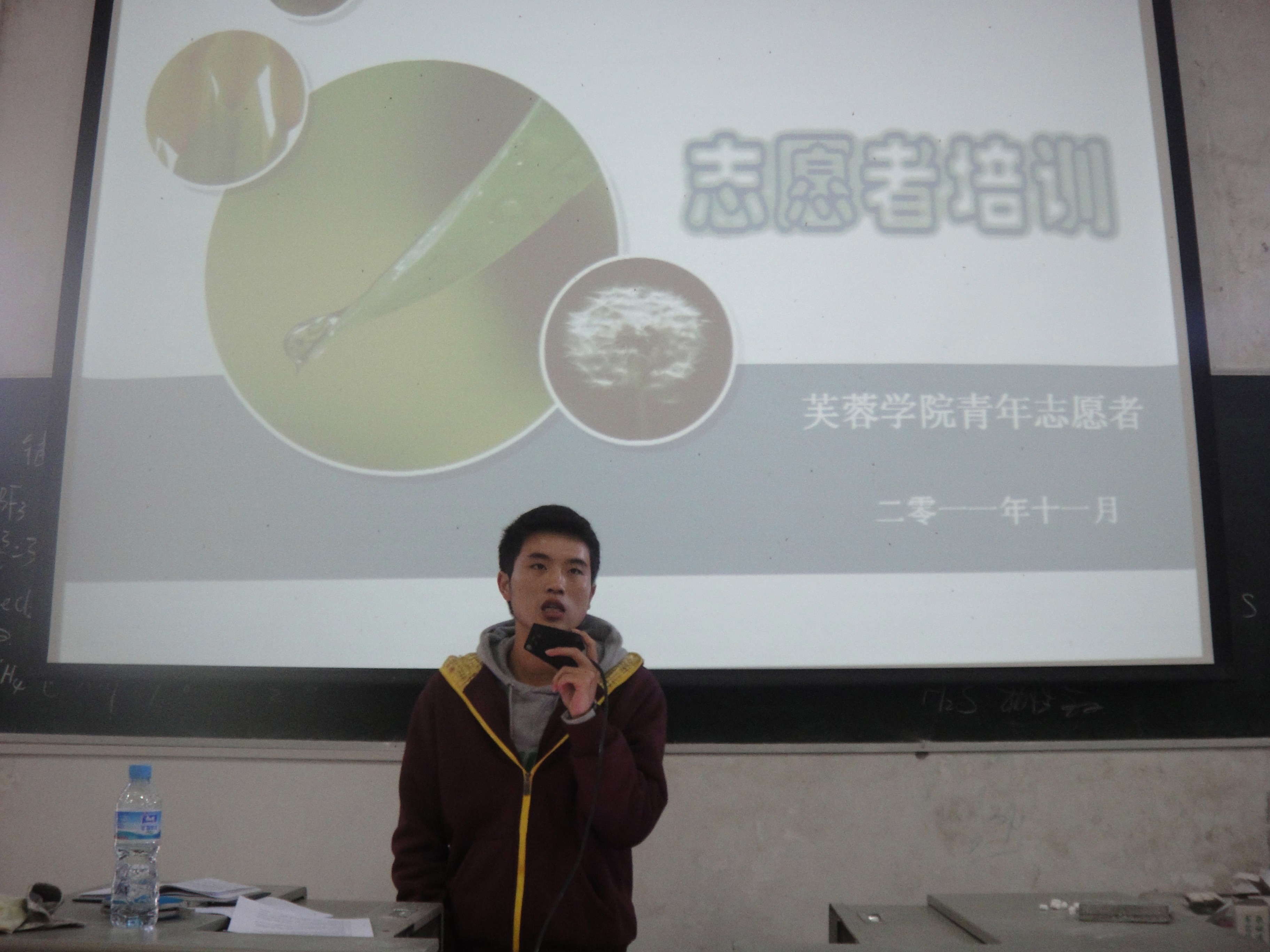 2011年11月25日,湖南文理学院芙蓉学院青年志愿者团队成立大会暨志愿者培训大会于我院T图北教室隆重举行。芙蓉学院团委副书记兰泽宇、团委副书记助理何颜、院团委组织部部长朱翔宇、实践部副部长王君球、李德生、各系团总支副书记以及志愿者团队全体成员共计106人参加了此次大会。此次会议由我院社会实践部部长徐小龙主持。