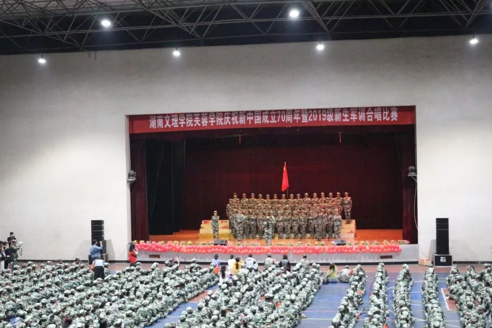 为加强新生的爱国主义教育,激发学生的爱国热情,展现芙蓉学子良好的精神风貌和艺术修养。2019年10月18日晚我院于体育馆隆重举行“庆祝新中国70周年暨2019级新生军训合唱比赛”。莅临本次合唱比赛的领导和评委老师有:芙蓉学院学工办主任朱骏老师、芙蓉学院团委书记张翠老师、芙蓉学院党政办干事李汶蓉老师、芙蓉学院艺体系辅导员李汶颖以及常德市军分区营长、参谋罗杰教官。