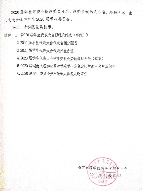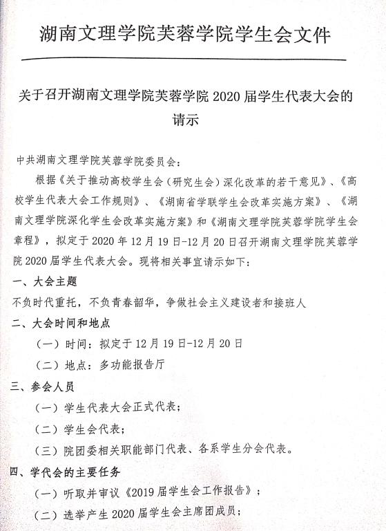1.《关于召开湖南文理学院芙蓉学院2020届学生代表大会的请示》
